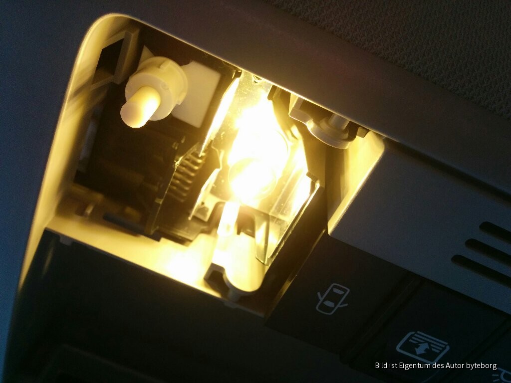 Zuerst die Schminkspiegel, zum Austausch der Lampe baut man die Leuchte am besten komplett aus. Dazu hebelt man sie jeweils links (sowohl auf der Beifahrerseite als auch Fahrerseite ist es jeweils die gleiche Seite) mit einem breiten Kunststoffkeil (siehe Bilder) raus. Danach wackelt man einfach so lange an der Stecksockellampe bis sie rauskommt. Neues LED-Leuchtmittel rein, Lampe wieder einklipsen, fertig.